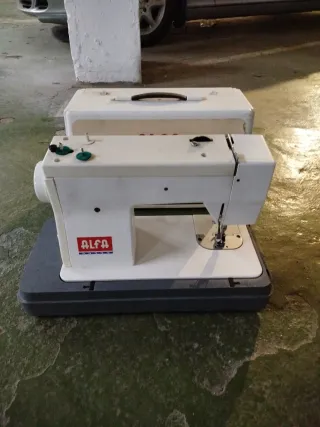 Máquina de coser antigua con su cubierta de madera.alfa esta muy cuidada Si no es muy lejos te la llevamos - Cubierta de madera con detalles. - Base metálica. - Rueda lateral.