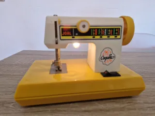 antiguo juguete maquina de coser Joal Coqueta ropa muñeca vintage retro funcionando a pilas juego Máquina de coser de juguete antigua de la marca Joal, modelo Coqueta. Un clásico para coleccionistas. - Diseño vintage en color blanco y amarillo. - Detalle de puntadas decorativas en la parte superior. - Incluye interruptor de encendido/apagado.