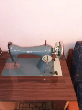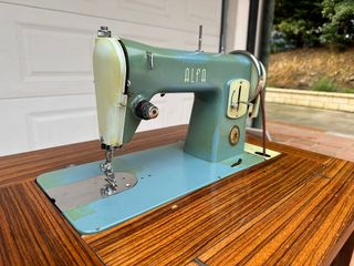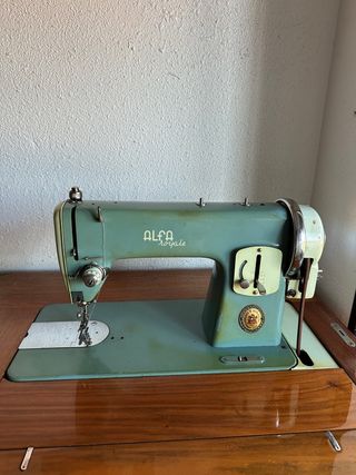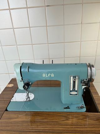 Máquina de coser Alfa 43 de estilo vintage, ideal para coleccionistas o amantes de la costura clásica. Medidas del mueble 55laego x 43ancho x 77 alto - Diseño retro en color azul. - Incluye su mueble de madera. - Perfecta para decoración o uso.