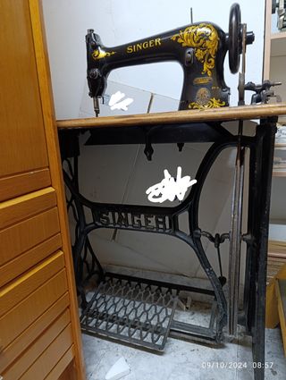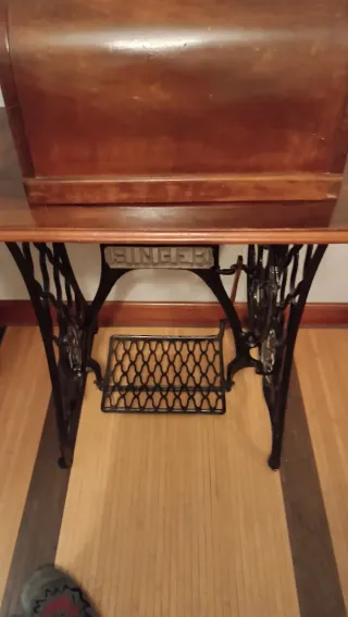 Máquina de coser Singer con detalles dorados y base de madera. - Diseño clásico y elegante. - Base de madera con cajón. - Soporte metálico para el pedal. Se encuentra en Villarcayo burgos