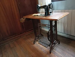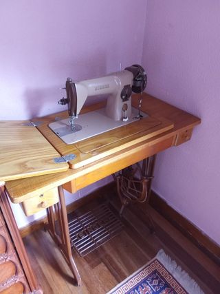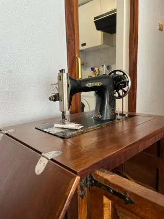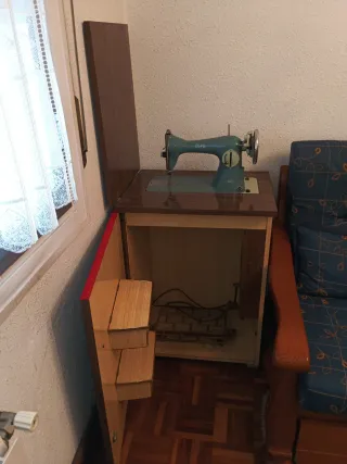 Vendo máquina de coser antigua, marca Singer. Funciona a pedal, no hay que conectarla a la corriente eléctrica, por lo que se puede instalar en cualquier lugar. La máquina está integraba en un armario de madera, el cual permite guardarla, pareciendo un mueble más de la casa. El armario es desplegable, actúa a modo de mesa. Incluye varios canilleros. Necesita puesta a punto.