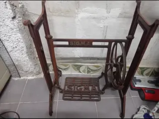 Base de pedal para máquina de coser antigua de la marca Sigma. Fabricada en metal - Diseño clásico. - Incluye rueda. - Soporte para el pie.