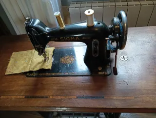 Máquina de coser antigua de la marca SIGMA, un clásico para coleccionistas o amantes de la costura. - Diseño vintage en color negro. - Detalles ornamentales dorados en la base. - Recoger en Gernika, Bizkaia