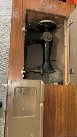 Máquina de coser antigua marca ALFA sin tabla lateral ni superior. Tiene accesorios, instrucciones y una correa sin estrenar. Hace años que no se usa, creo que seguirá funcionando