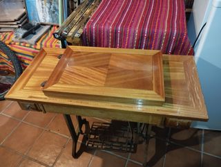 Máquina de coser antigua con un bonito diseño de madera. - Estructura de madera con detalles. - Base metálica. - Cajones integrados.