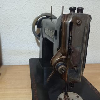 Máquina de coser Singer antigua, un clásico que funciona perfectamente. Ideal para coleccionistas o para darle un toque vintage a tu hogar. - Diseño clásico con detalles dorados. - Base de madera. - Soporte metálico ornamental.