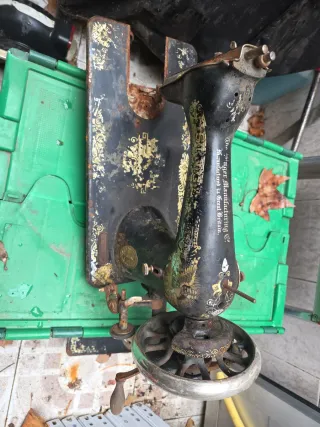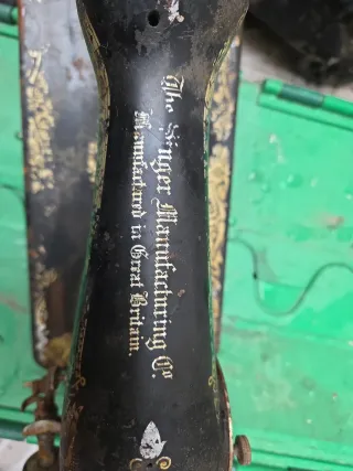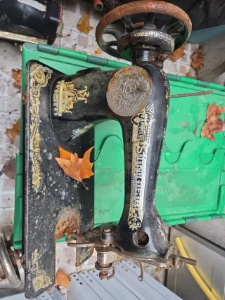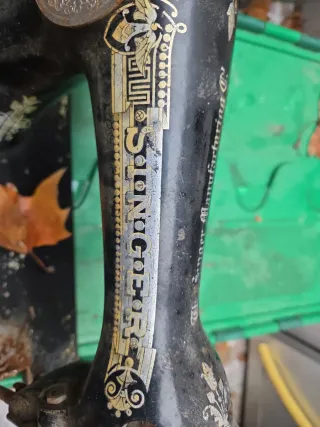 Máquina de coser Singer antigua con detalles decorativos dorados. Presenta signos de óxido y desgaste, reflejo de su antigüedad y uso. Se vende tal como se ve la foto