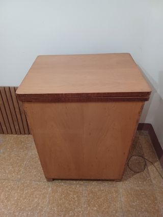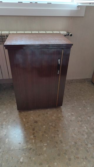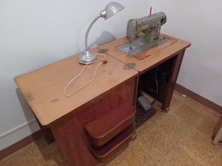 Maquina de coser antigua con mesa y tapa, como se ve en las fotos