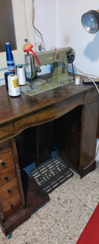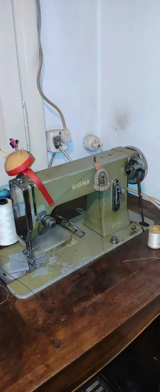 Máquina de coser clásica de la marca SIGMA, un modelo antiguo con un diseño retro. - Cuerpo de metal en color gris azulado y crema. - Detalles de la marca SIGMA visibles. - Incluye dial de selección y palanca de ajuste. - Base de madera.