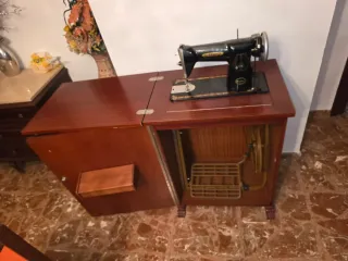 Máquina de coser Singer clásica, ideal para coleccionistas o amantes de la costura tradicional. Su diseño atemporal la convierte en una pieza decorativa. - Mecanismo de pedal. - Incluye un mueble de madera.