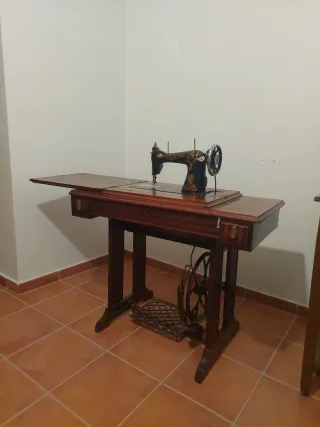 Maquina de coser antigua con pedal de la marca Singer con mueble. Funciona bien.