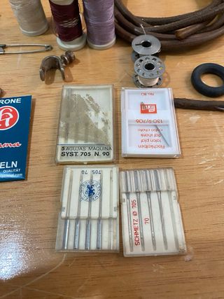Conjunto de accesorios para máquina de coser, ideal para reparaciones y proyectos. - Variedad de agujas de diferentes tamaños. - Hilos de varios colores. - Bobinas para hilo. - Accesorios adicionales como imperdibles y prensatelas. Herramienta de costura agujas, hilo de coser, máquina de coser Antiguo Antiguedades, decoración Colección. Trabajo costura, costurero, jersey, pantalones camisetas, camisas mantas, mantones, sábanas, ropa, Antiguo, Antigüedades, decoración, colección coleccionista, coleccionismo, madera con aluminio, metal, cobre, decoración, colección costurera, costurero, Antiguo, antigüedades, decoración, colecció