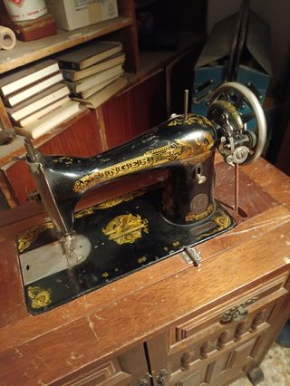 Máquina de coser antigua. Marca Sigma Está muy bien conservada. De color negro con dibujos en oro, como se ve en las fotos. Viene con su mueble (se nota el uso) para poderla guardar si no se utiliza. Dentro del mueble está la estructura metálica y el pedal, así como el compartimiento donde 'esconder' la máquina. Igual hay que cambiar correa. Las medidas son del mueble Ancho 60cm Profundidad 45,5cm Alto 78cm Por su peso y medidas se recoge en persona en el domicilio