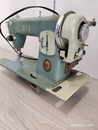 Máquina de coser antigua de la marca Alfa, con su maletín original de madera. - Diseño clásico y elegante. - Incluye el maletín de transporte. - Ideal para coleccionistas o decoración.