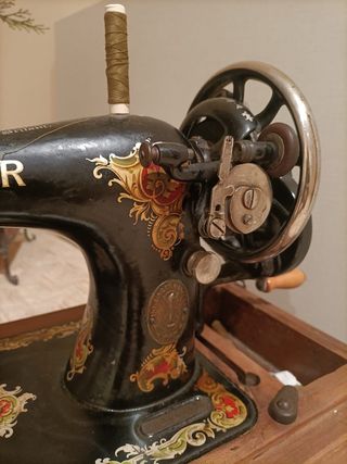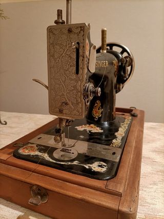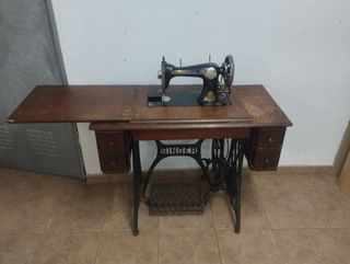 Se vende máquina de coser Singer antigua con mueble de costura. Se puede ver el número de serie (la máquina es de principios del siglo XX, en concreto del año 1921). Está engrasada, con la cuerda de cuero nueva y el mueble es de madera, está lijado y abre y cierra perfectamente. Le falta ponerla a punto para su uso ajustando el pedal al mueble (si acaso quiere usarse para coser).
