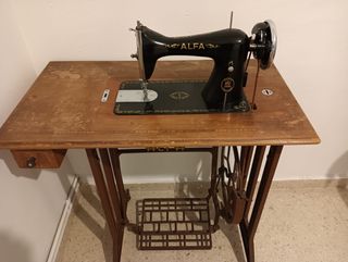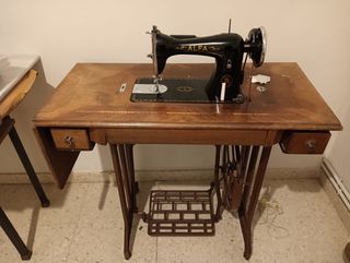 Máquina antigua Alfa junto al mueble. Funcioan perfectamente. El mueble tiene algún desperfecto por el paso del tiempo. La máquina funciona muy bien. La vendo porque yo no la se usar.