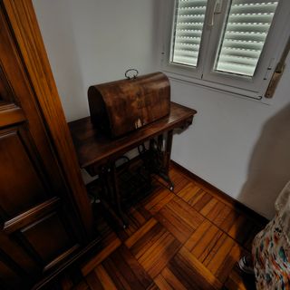 Máquina de coser a pedal con mueble incluido. La máquina se esconde dentro del mueble mediante un mecanismo, ocultando la maquina y dejando a la vista un mueble antiguo con una puerta. Madera de buena calidad. La máquina funciona perfectamente, va a pedal. La vendo por mudanza. Cualquier duda, preguntar sin compromiso. Gracias.