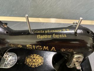 Máquina de coser antigua de la marca SIGMA, modelo Elgothar España. - Diseño clásico en color negro. - Detalles decorativos dorados en la base y el cuerpo. - Volante lateral para operación manual.