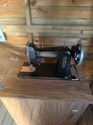 Máquina de coser antigua de la marca Wertheim, con un diseño clásico y elegante. - Color negro brillante. - Incluye volante lateral para manejo manual. - Montada sobre mueble de madera con tapa.
