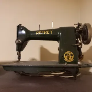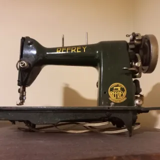 Máquina de coser Refrey de estilo antiguo, equipada con motor. - Diseño clásico en color verde oscuro. - Detalles de la marca Refrey en dorado.