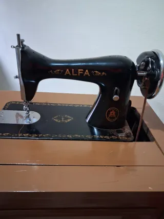 Máquina de coser Alfa de estilo vintage, ideal para coleccionistas o amantes de la costura clásica. - Diseño clásico en color negro. - Marca: Alfa. - Incluye su base de madera.