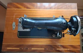 Máquina de coser Singer funciona y cose como el primer, con un diseño clásico y elegante. Su estructura metálica y detalles en madera le dan un toque vintage. - Base de hierro fundido con el nombre de la marca. - Cubierta de madera con asa. - Pie de costura.