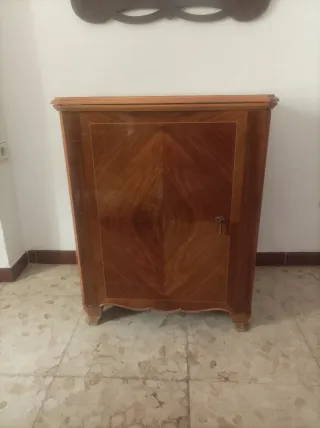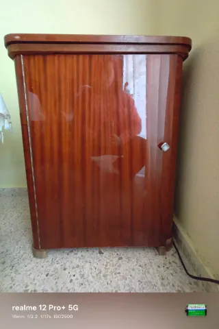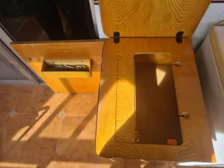Mueble vintage de madera, ideal para máquinas de coser. - Diseño clásico con acabado en tonos madera. - Compartimento para accesorios.