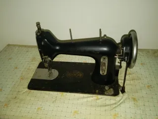 Máquina de coser antigua de la marca SIGMA. Un clásico para coleccionistas o para quienes aprecian los objetos vintage. - Diseño clásico en color negro. - Detalles decorativos dorados. - Volante lateral para operación manual.