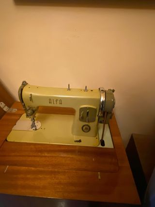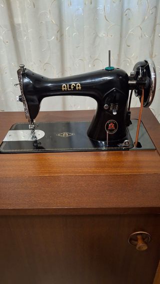 Máquina de coser Alfa de estilo vintage, ideal para coleccionistas o amantes de la costura clásica. Se encuentra dentro de un mueble de madera con tapa. - Diseño retro. - Mueble de madera con tapa abatible.