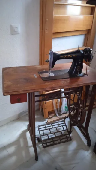 Máquina de coser ALFA muy antigua pero funcional, con su mueble original de madera, una antigüedad. Un diseño clásico que aporta un toque vintage a tu hogar. - Funcionamiento con pedal y correa. - Puerta frontal con tirador.