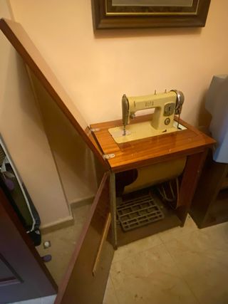 Máquina de coser antigua con su mueble original. - Diseño clásico. - Mueble de madera con detalles. - Ideal para coleccionistas o decoración.