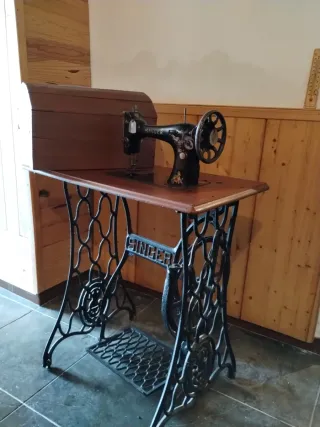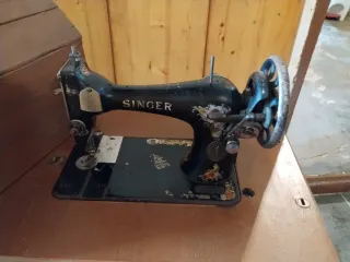 máquina de coser antigua marca Singer. Fabricada principalmente en hierro fundido, lo que la hace muy pesada y duradera. Estas máquinas Singer fueron muy populares durante el siglo XX (especialmente entre los años 1930 y 1960). El mecanismo que se ve en un costado servía para ajustar la longitud de la puntada, y el volante (rueda lateral) se usaba para accionar la aguja manualmente o mediante pedal. Importante: Máquina para coleccionismo, ya sea para dejarla como está o restaurarla, no se si funciona.