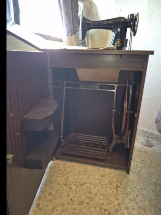 Máquina de coser antigua SIGMA con mueble y pedal – Vintage Vendo máquina de coser SIGMA antigua, original, con mueble de madera y pedal de hierro, en muy buen estado de conservación para su edad. ✔ Marca española SIGMA ✔ Sistema de pedal (treadle) ✔ Mueble original de madera ✔ Ideal tanto para coleccionistas, decoración vintage, escaparates o amantes de la costura tradicional La máquina se mueve y el pedal acciona el mecanismo (ver fotos). No ha sido restaurada, conserva su pátina original, lo que le da mucho encanto. Estado general muy bueno, tal como se aprecia en las imágenes. 📍 Recogida en mano (por peso y tamaño)