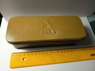 De metal de los años 60. Vacía con señales de uso. Mide 18x7x5 cm.