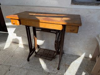 Mesa de aluminio y maderay maquina antigua de cose