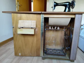 Máquina de coser antigua Alfa, un clásico para tu hogar. - Diseño vintage con detalles en madera. - Mecanismo de pedal integrado en el mueble.