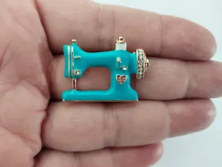 Original y bonito broche de una máquina de coser antigua, vintage. Esmalte de color azul verdoso y acabados dorados con pequeños detalles de piedras de strass. Medidas en fotos. A ESTRENAR. CB 1.