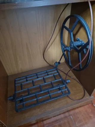 Pieza de máquina de coser antigua, ideal para coleccionistas o decoración. - Incluye pedal de accionamiento. - Volante de gran tamaño. - Estructura de metal y madera.