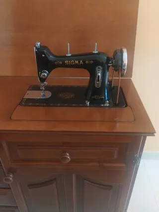 Máquina de coser Sigma clásica, ideal para coleccionistas o amantes de lo vintage. Se encuentra dentro de un mueble de madera que la protege y facilita su almacenamiento. - Diseño retro. - Mueble con tapa abatible y puerta frontal. - Incluye pedal de pie.