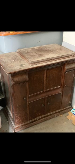 mueble antiguo de máquina de coser, en madera de castaño, diseño único y difícil de encontrar, de anticuario. Para restaurar.