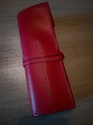 Estuche artesanal para guardar lápices, fabricado en cuero vacuno. - Material: Cuero. - Diseño: Hecho a mano completamente desde el patrón, corte y cosido (sin máquina). - Color: Rojo. Cierre mediante tira del mismo cuero. Puede hacerse por encargo en otros colores.