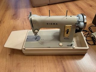 Máquina de coser SIGMA muy robusta. Ideal para vaqueros gruesos y lonas. Funciona perfectamente motor y pedal, solo hay que ponerle la goma que va a la polea que es muy económica de 5 o 6 €. Mejor ver y probar.Tiene muchas funciones, una tapa que se puede quitar con hueco para poner canillas e hilos y esa tapa se pone al lado como reposador de la ropa. Antes andaba con pedal, pero le puse el motor eléctrico con su pedal. Tiene luz, directa a la costura. No envío, solo en persona, por el peso.