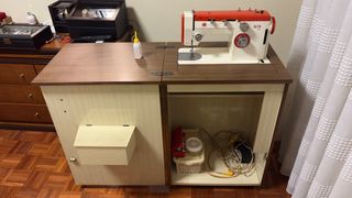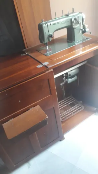 Máquina de coser automática de la marca Refrey; con mueble de madera; juego de patillas, libro de instrucciones, motor eléctrico industrial; lista para coser y hacer labores.