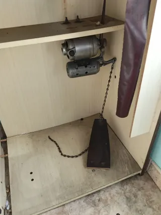 Motor eléctrico para máquina de coser, con cadena de sujeción. Funciona a 125v Probado y funcionando - Cuerpo metálico. - Incluye enchufe. - Cadena para colgar o sujetar.