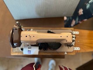 Preciosa máquina de coser eléctrica antigua con mueble. Ideal para amantes de lo vintage. - Máquina de coser en buen estado. - Mueble de madera en color marrón oscuro. - Incluye pedal y rueda de accionamiento. - Perfecta para costura y decoración.