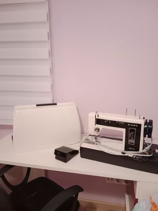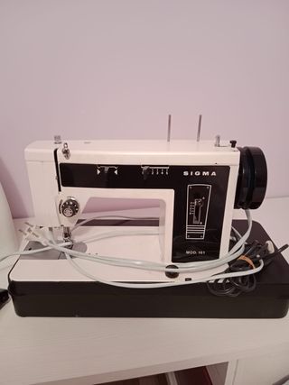 Máquina de coser Sigma modelo 161. - Diseño clásico en blanco y negro. - Incluye su base. - Ideal para trabajos de costura. Con pedal electrico y funda, practicamente nueva