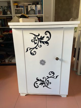 Maquina de coser Singer , con levas de bordar , motor eléctrico y manual,con mueble auxiliar de diseño moderno con detalles decorativos. - Acabado en color blanco. - Adornos florales en color negro. - Tirador metálico. - Diseño de estilo contemporáneo.