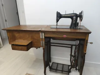Máquina de coser antigua de la marca SIGMA, presentada en un mueble de madera y pedal. ✔ Mueble de madera en buen estado ✔ Máquina clásica de hierro, muy robusta ✔ Sistema de pedal (sin electricidad) ✔ Cajón lateral para accesorios ✔ Ideal como decoración vintage o para restaurar Se ha conservado en interior. Tiene desgaste normal por los años, lo que le da un bonito aspecto vintage.