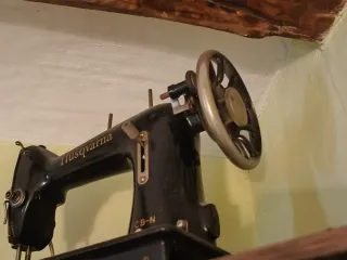 Máquina de coser antigua Husqvarna19 con pedal funciona - Fabricada en Suecia. - Incluye etiqueta de F. Mühlheim, Hutgasse 10, Basel. O cambio por un casco de moto o algo de ropa de fútbol, miro todo, también vale bien como adorno
