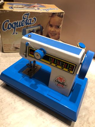Máquina de coser de juguete Coqueta con su caja original. - Diseño en color azul y blanco. - Incluye detalles decorativos en la parte frontal. - La caja muestra una imagen de una niña sonriendo y el nombre de la marca.